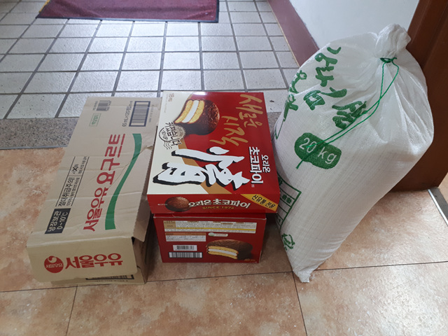 쌀(20kg) 1포대, 초코파이 2박스, 요구르트 1박스 주식,간식 후원