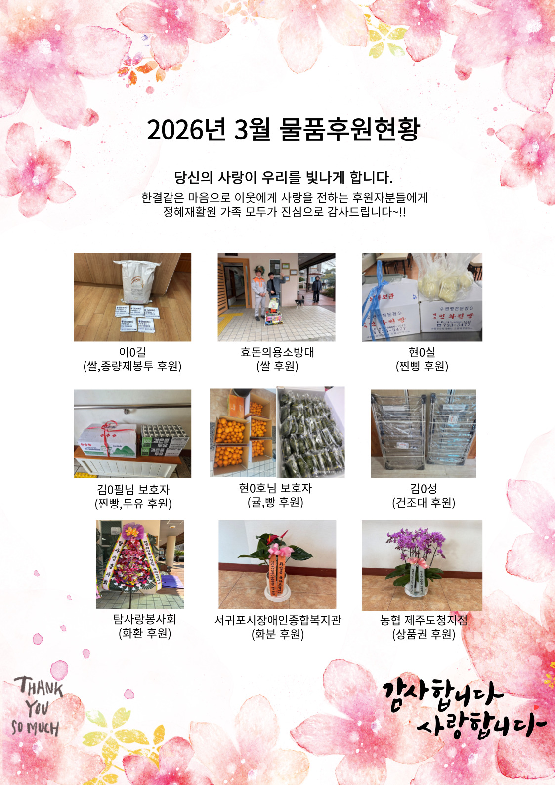 지난 3월에도 많은 분들이 여러 물품들을 후원해주셨습니다.